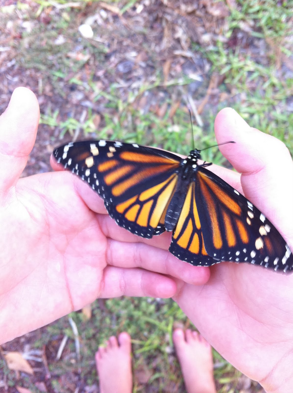 You can tell if the butterfly is male or female by the dots on its wings. This one is female, it doesn't have the dots.